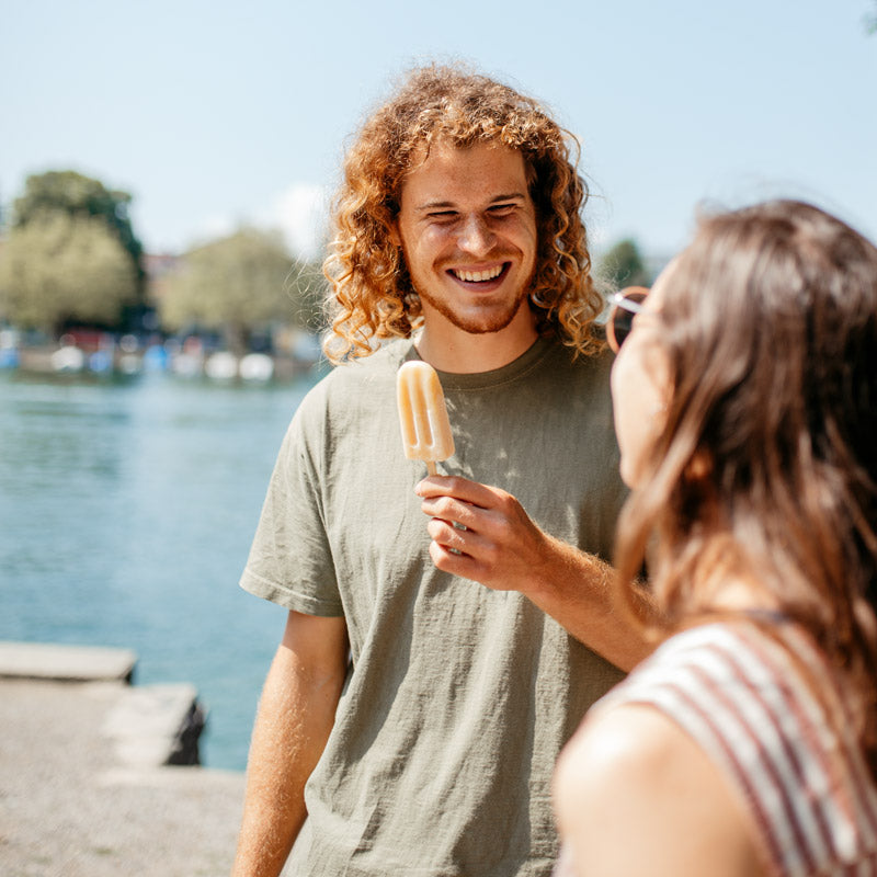 Apfel-Holunder Fruchteis so richtig nach Sommer in der froobie Heimat, der Bodenseeregion schmecken. Wir beziehen den naturtrüben Bio-Apfelsaft von der Insel Mainau und den Bio-Holunderblütensirup vom Naturhof Heinzler aus Pfullendorf.